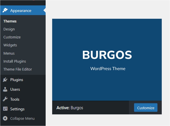 In WordPress dashboard go to appearance/themes and activate theme „Burgos“.