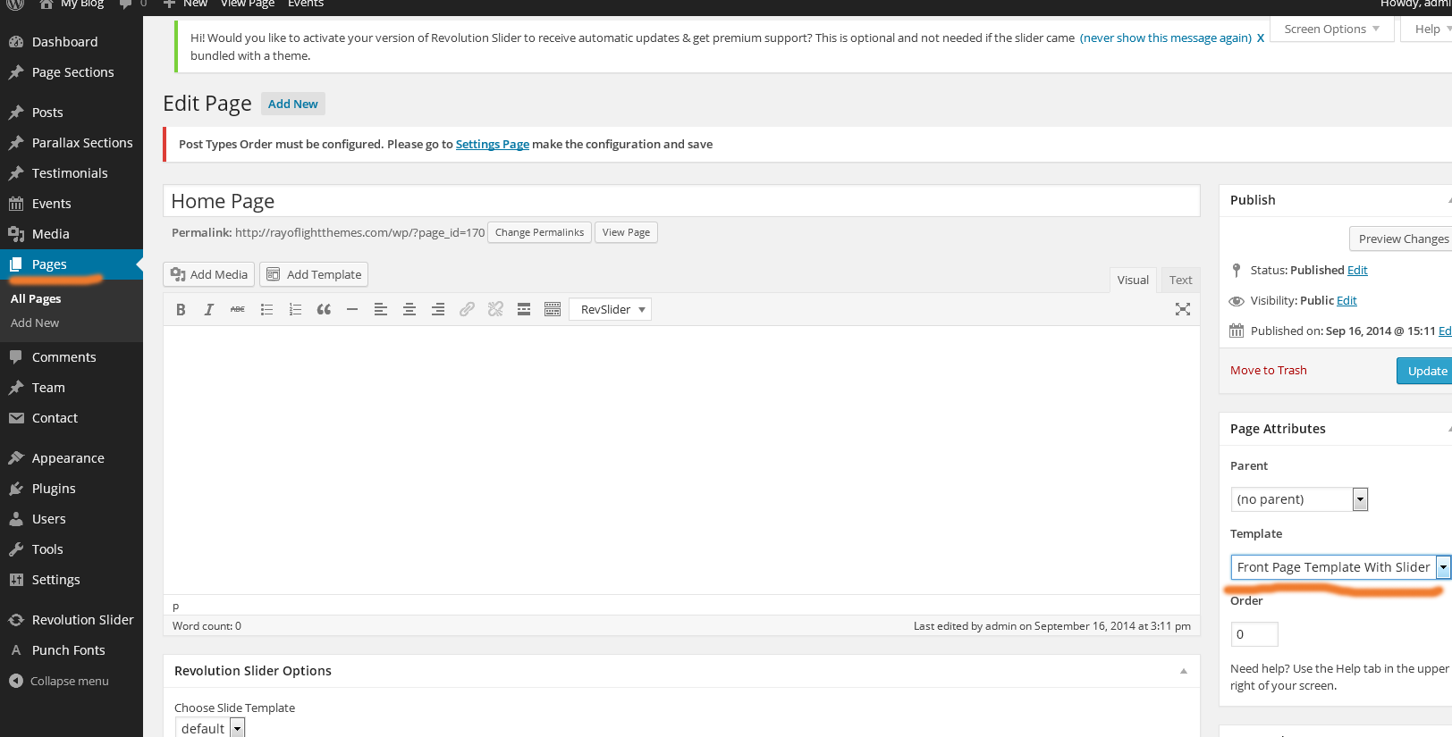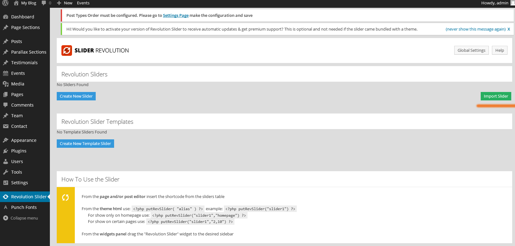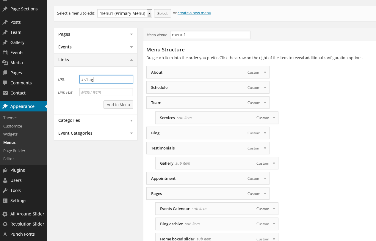 Custom post types in this Theme are: "Team" and "Testimonials". "Events" custom post type is added via plugin (see more above about plugins and shortcodes). Links for custom post types are in top left of Dahsboard.