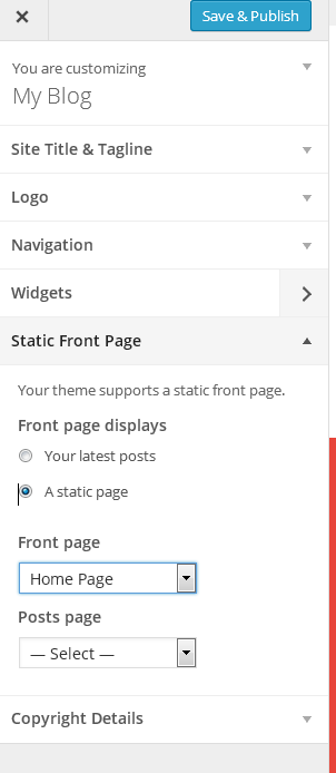 8. Go to appearance/customize and add your copyright details, upload logo and add site title and tagline.