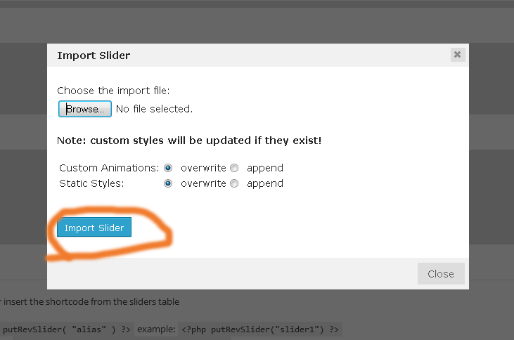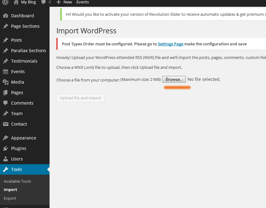 9. Now click to "Revolution slider" in Dashboard and upload revslider_slider_for_import/revslider1.zip file contains demo content and add your images in it. Official plugin page: http://codecanyon.net/item/slider-revolution-responsive-wordpress-plugin/2751380