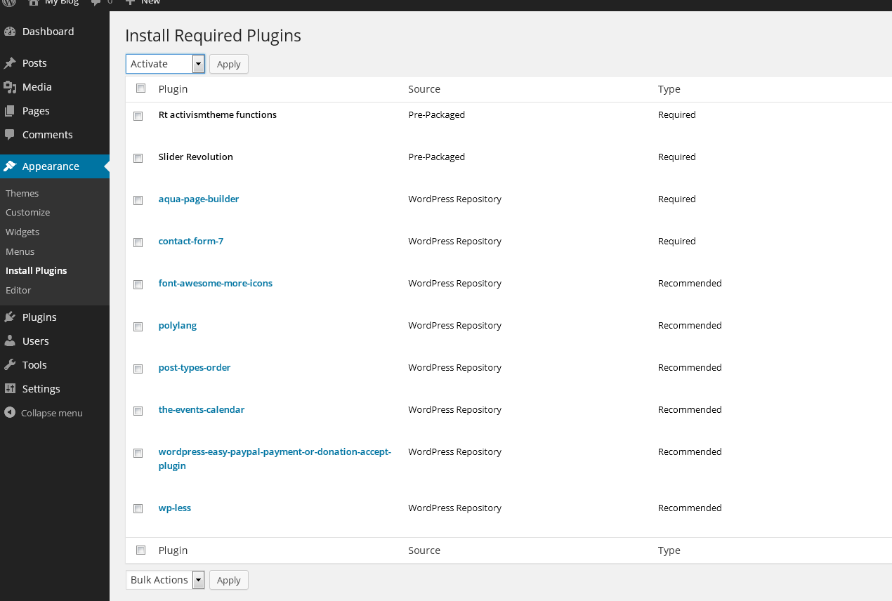2 plugins are bundled with theme: 1. Rt activismtheme functions, 2. Revolution slider and other plugins are recommended by theme.