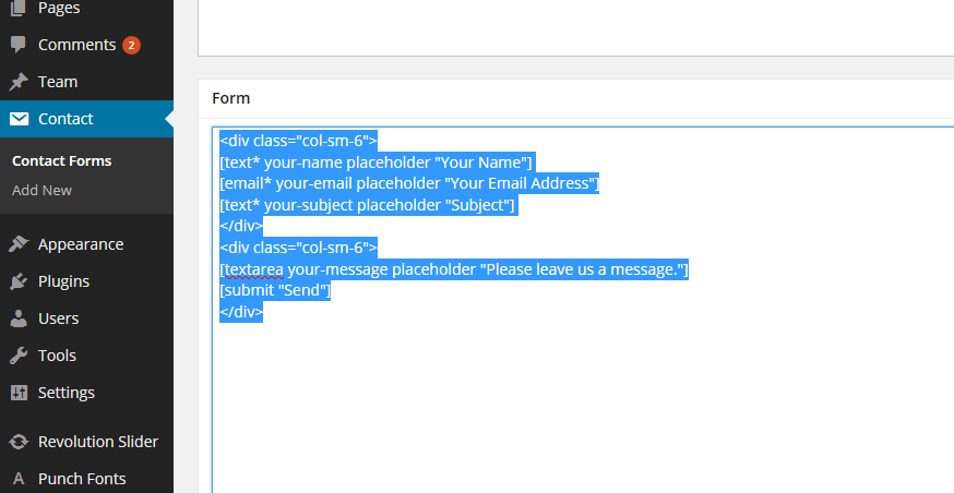 <div class="col-sm-6"> [text* your-name placeholder "Your Name"] [email* your-email placeholder "Your Email Address"] [text* your-subject placeholder "Subject"] </div> <div class="col-sm-6"> [textarea your-message placeholder "Please leave us a message."] [submit "Send"] </div>