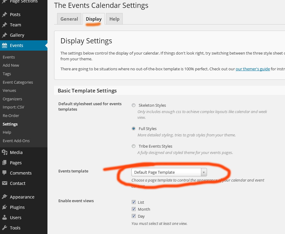 Change „events template“ to "Default page template" and save