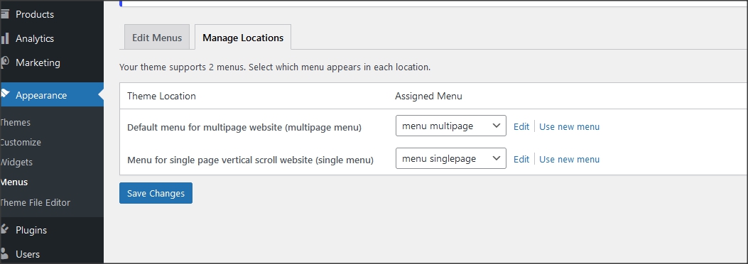 7. Go to appearance/menus and connect menus on menu places. "Menu multipage" to "Default menu for multipage website" and "menu singlepage" to "Menu for single page vertical scroll website". These menus can be changed on pages with page templates.