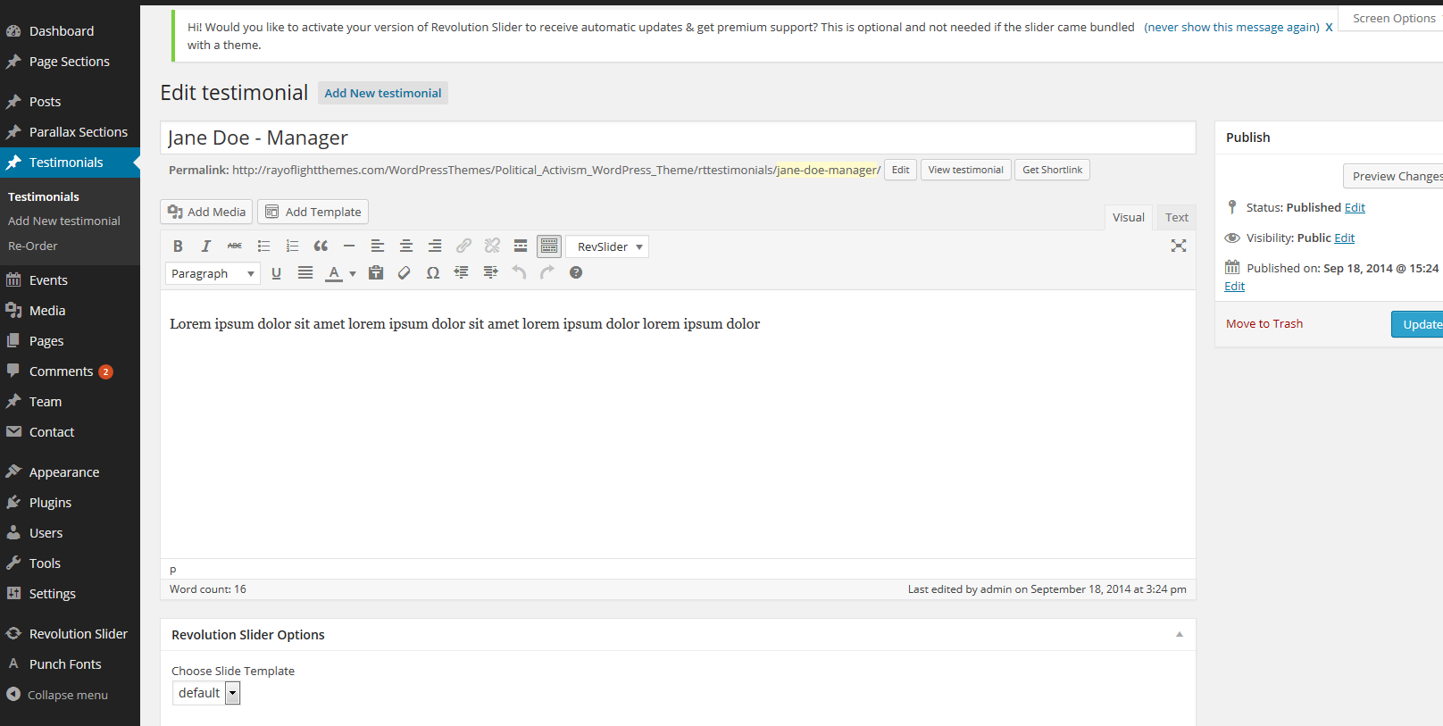 "Testimonials" custom post type can be added in Theme via shortcode [activismtheme_testimonials] (in Theme demo it is added in one of Parallax section posts), more information about shortcodes above.