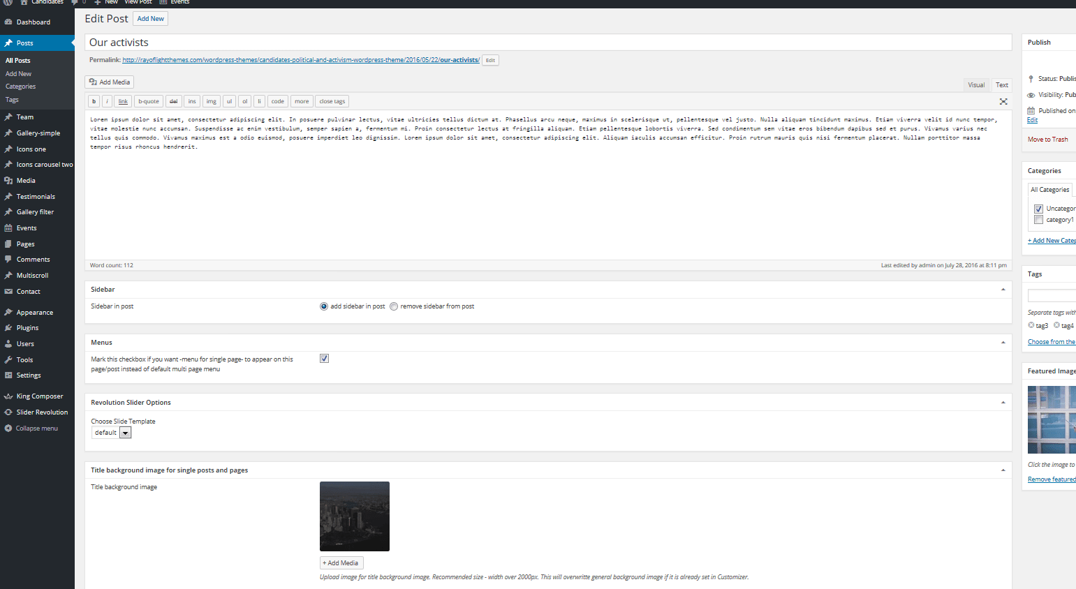 - It has same custom options like default single posts (option for sidebar, option for title background image).
