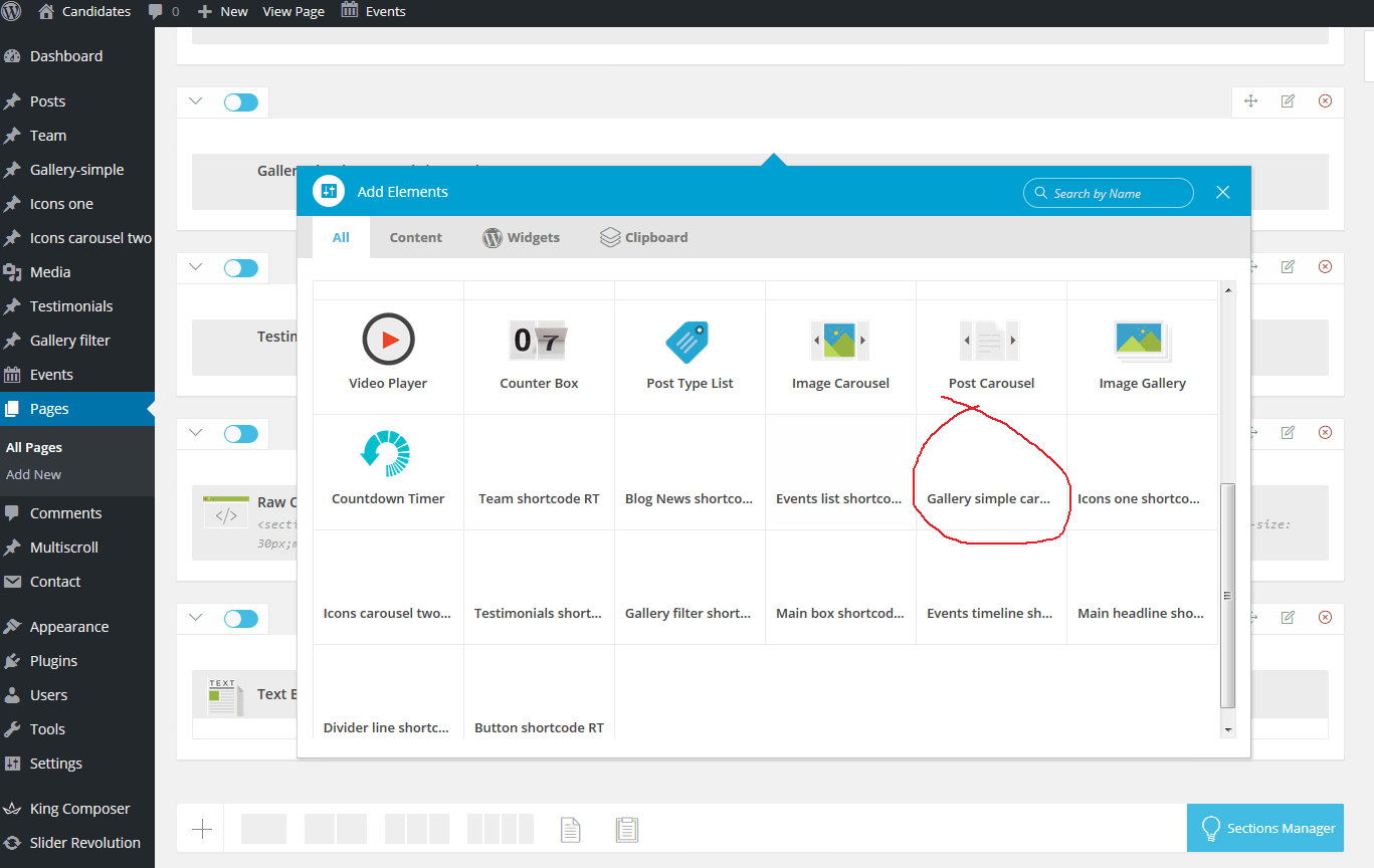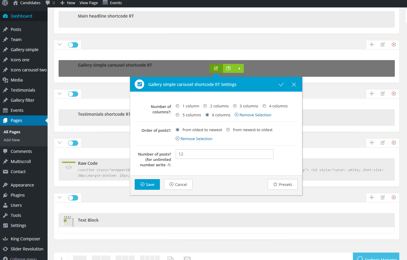 - To have "gallery simple" posts appear on pages, use page builder element "gallery simple shortcode RT" and it's settings.