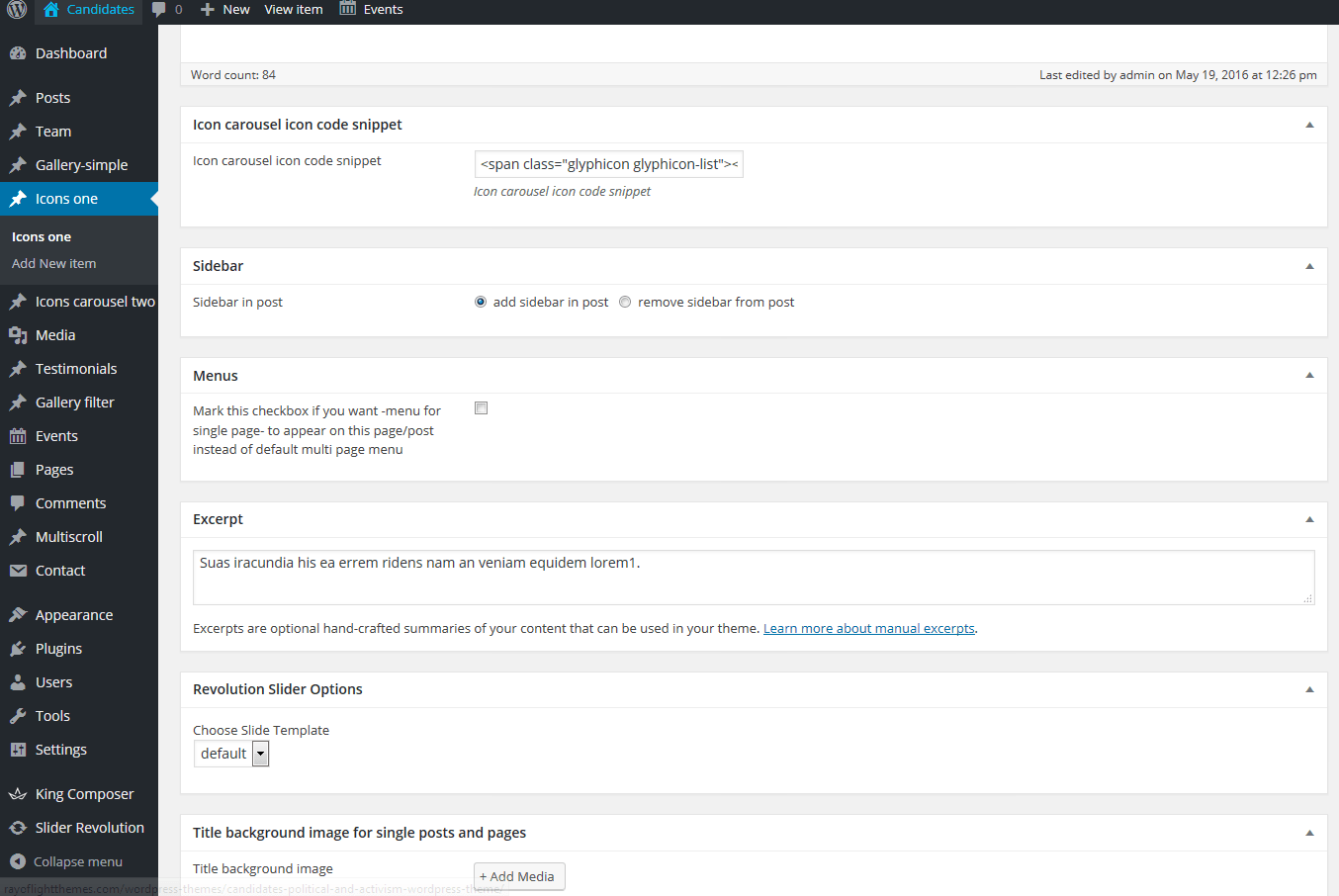 - "Icons one" is theme specific custom post type. (code for "icons one" and other custom post types is in rt-candidates-theme-functions plugin, that is bundled with theme).