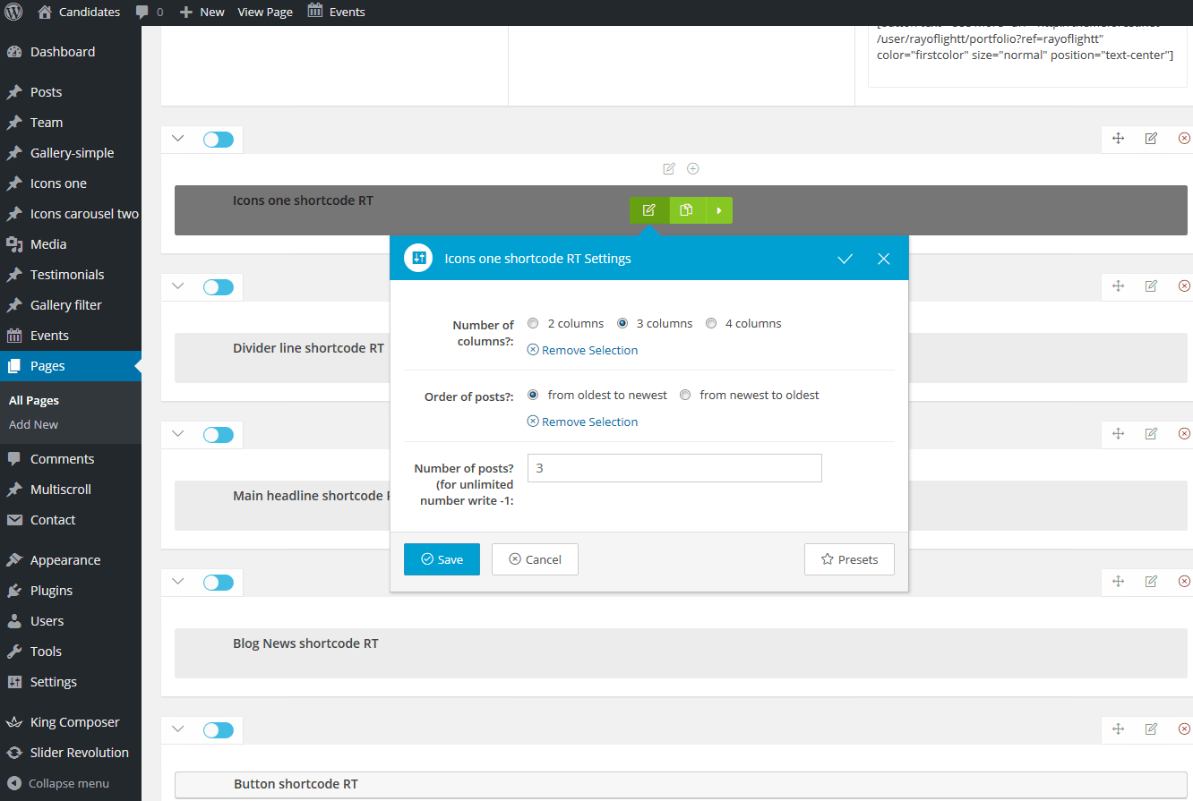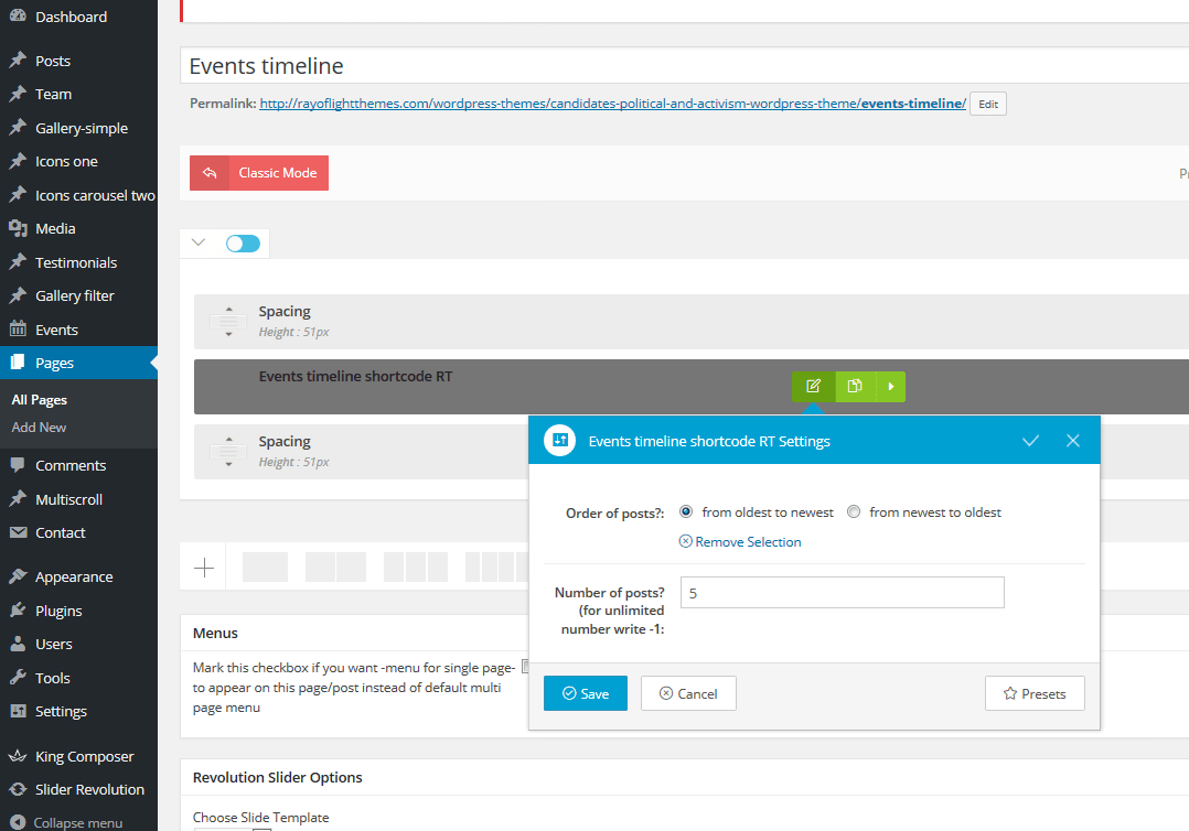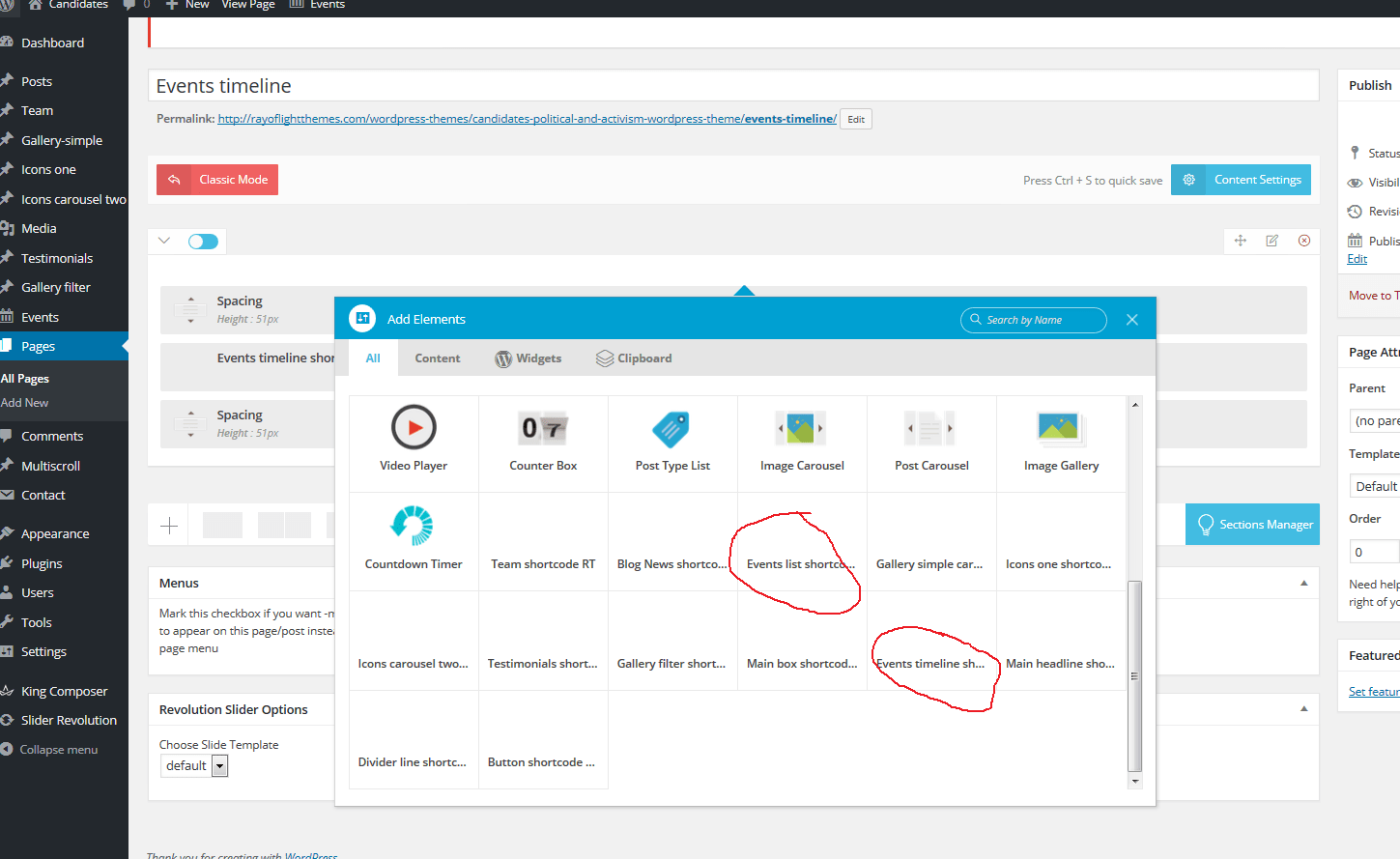 - To have events posts appear on pages, use page builder's element "events list shortcode RT" or "events timeline shortcode RT" and it's settings. Events posts can be displayed using page templates as well. More about page templates in section "pages and page templates."