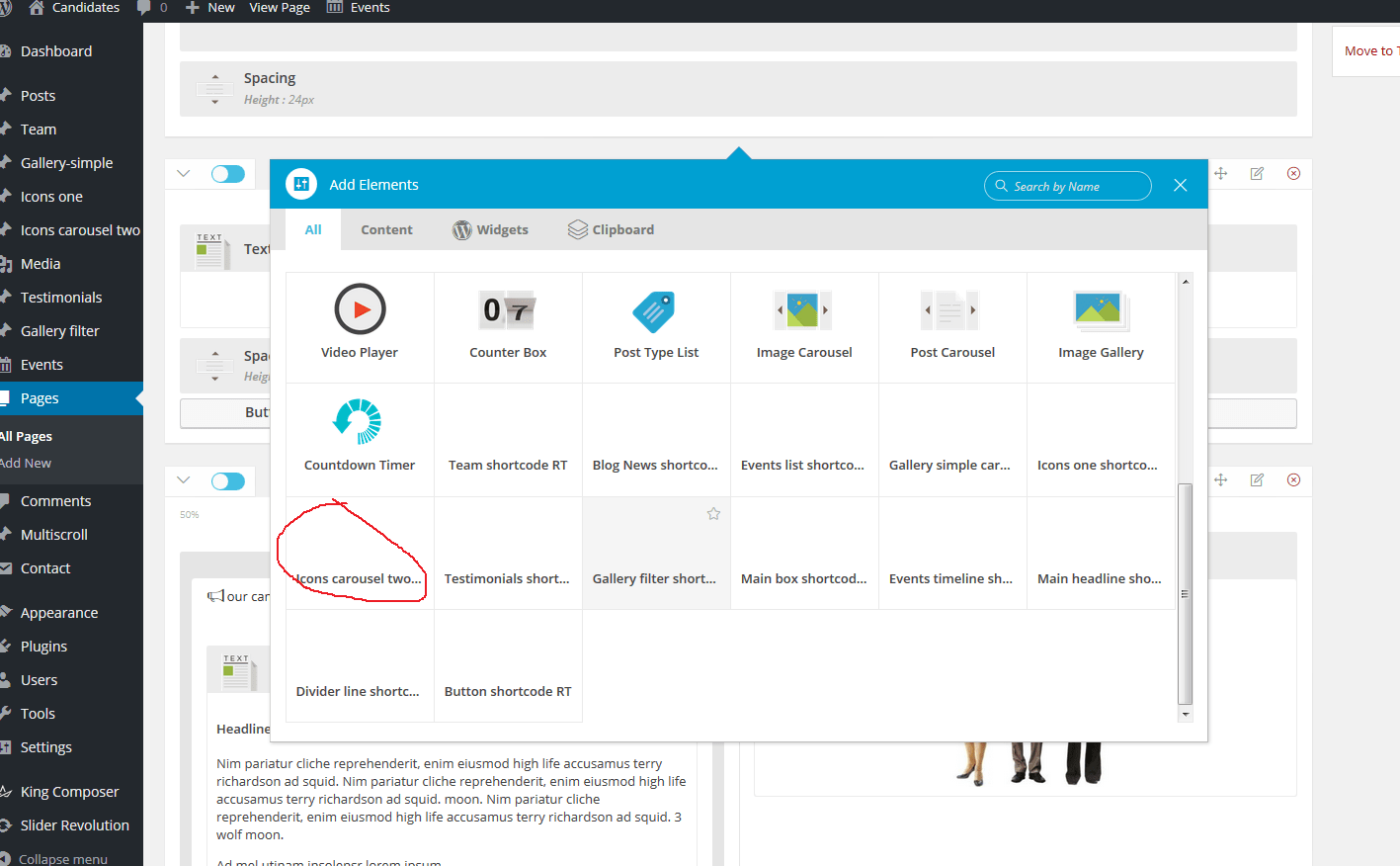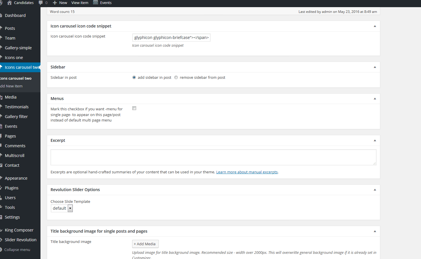 - "icons carousel two" is theme specific custom post type. (code for "icons carousel two" and other custom post types is in rt-candidates-theme-functions plugin, that is bundled with theme).