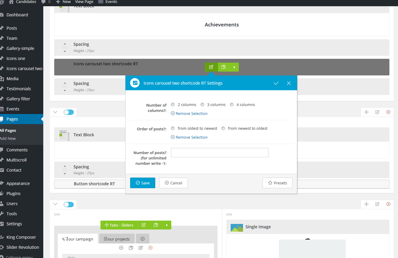 - To have "icons carousel two" posts appear on pages, use page builder element "icons carousel two shortcode RT" and it's settings.