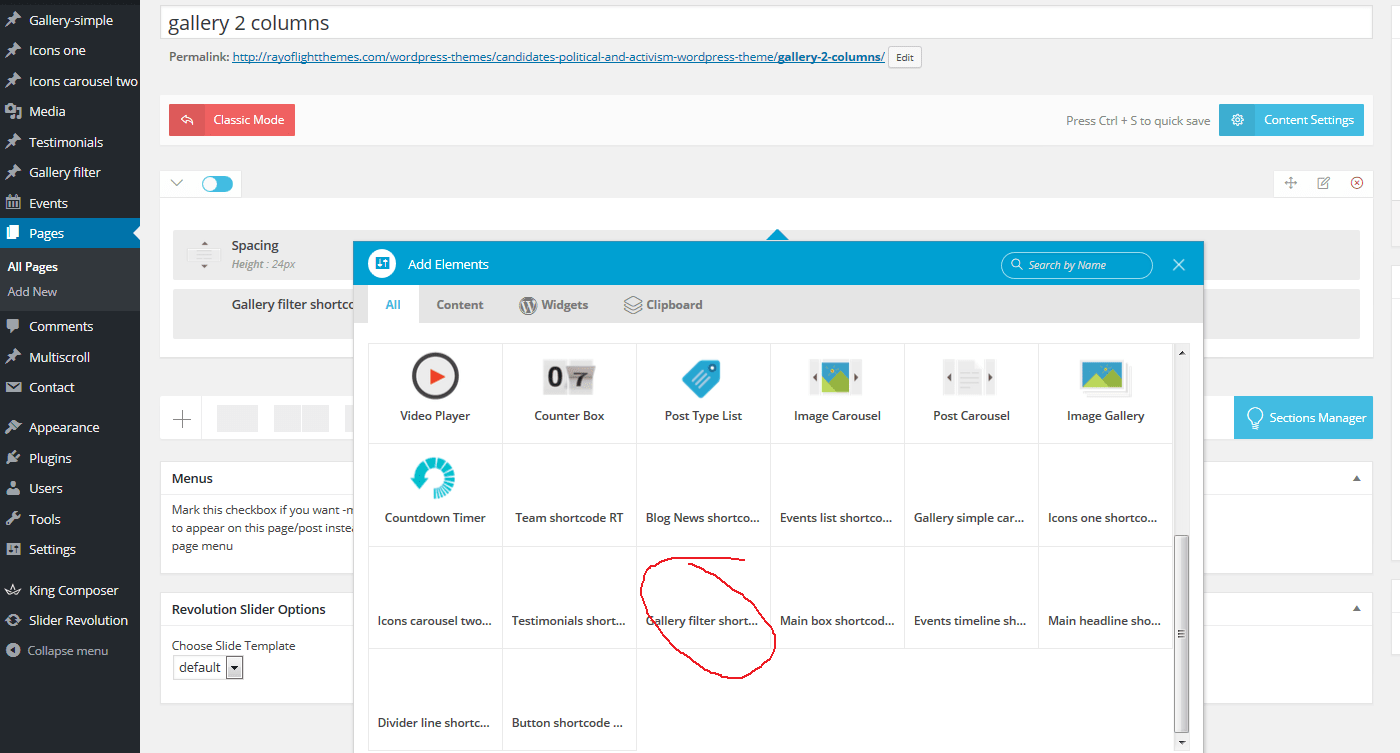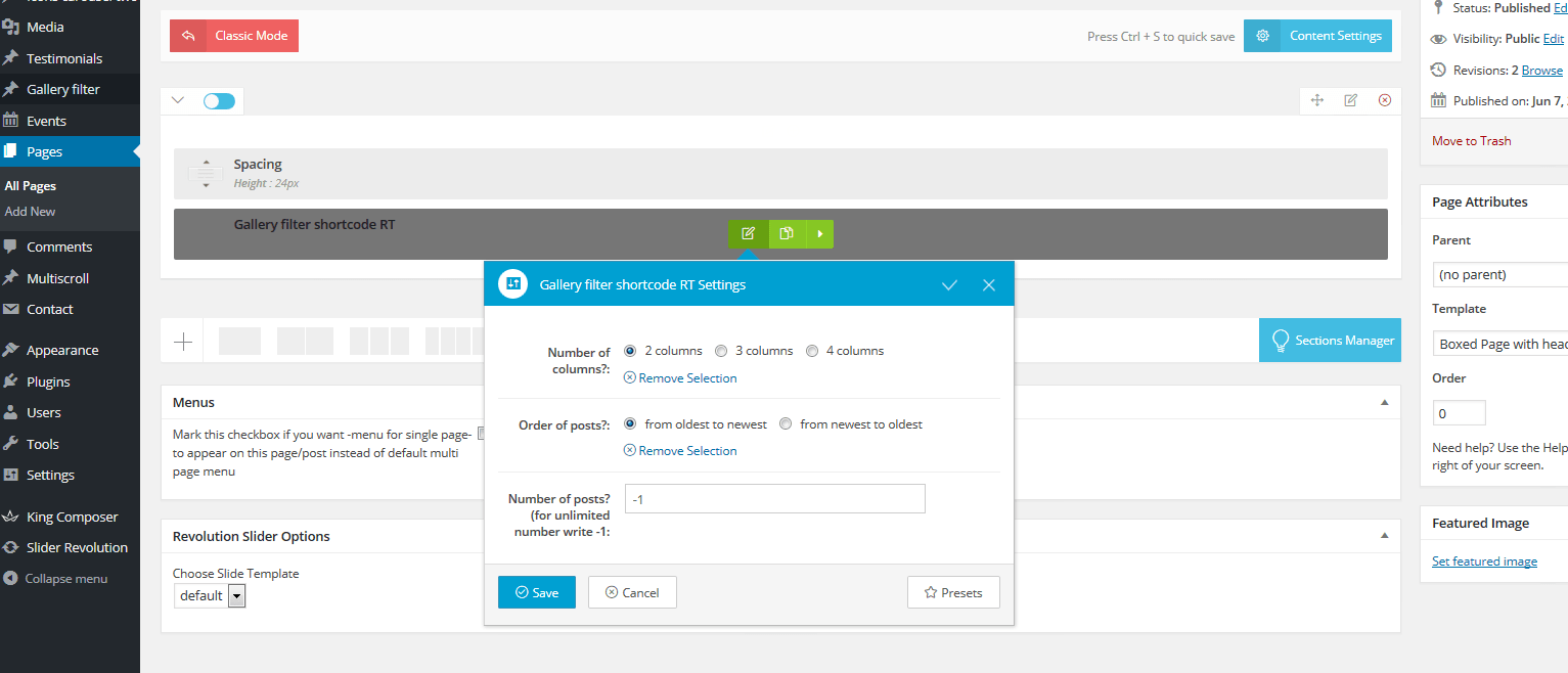- To have "gallery filter" posts appear on pages, use page builder element "gallery filter shortcode RT" and it's settings.