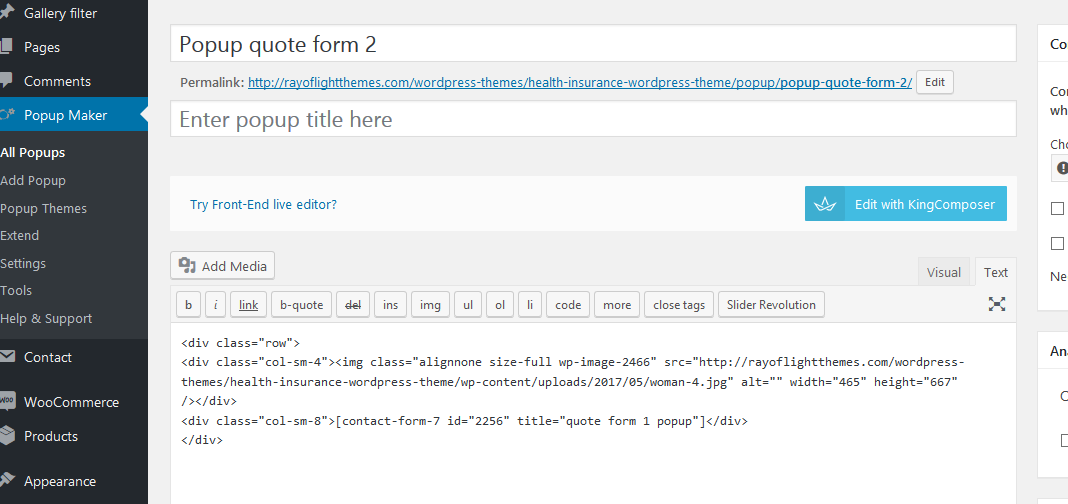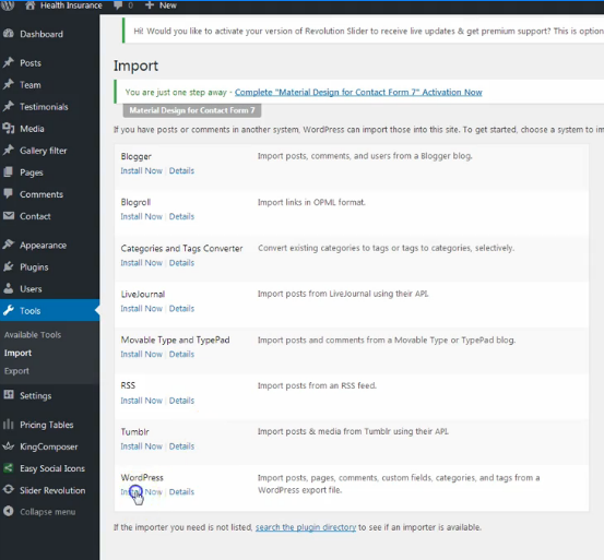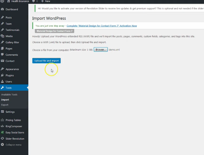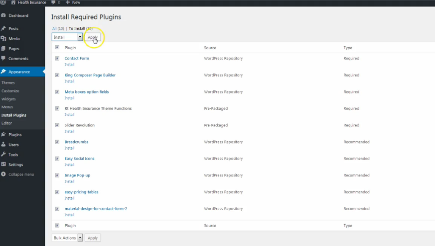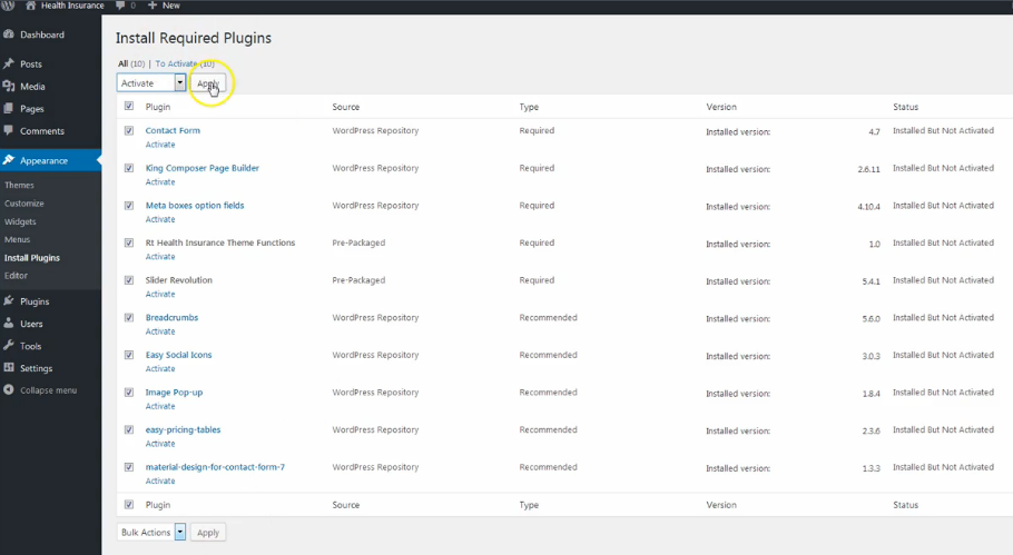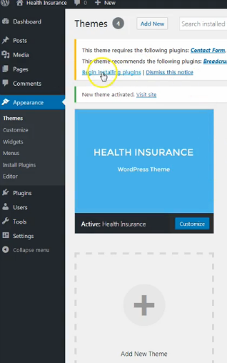 In WordPress dashboard go to appearance/themes and activate theme „Health Insurance“.