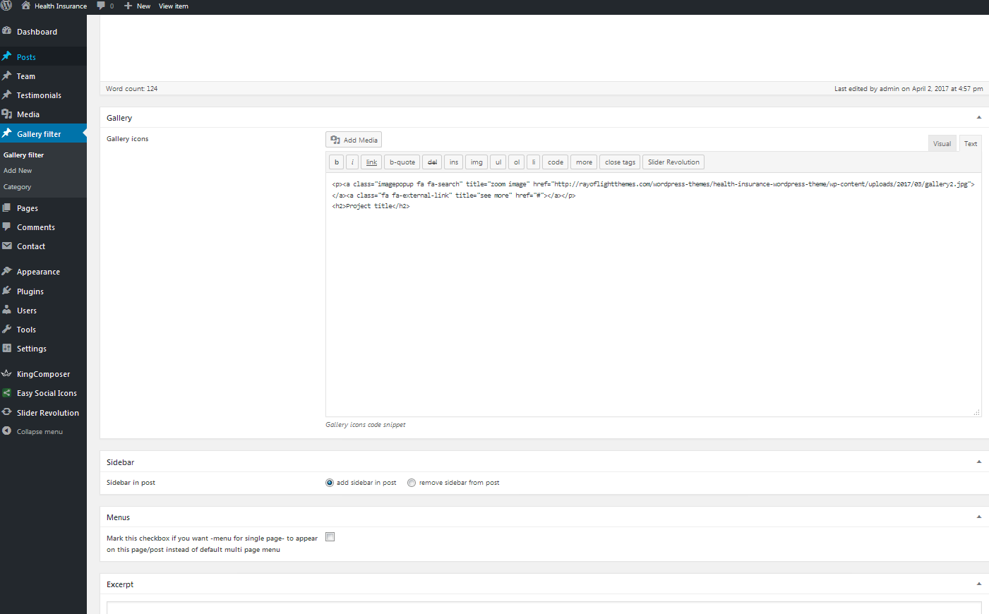 - "gallery filter" is theme specific custom post type. (code for "gallery filter" and other custom post types is in rt-healthinsurance-theme-functions plugin, that is bundled with theme).