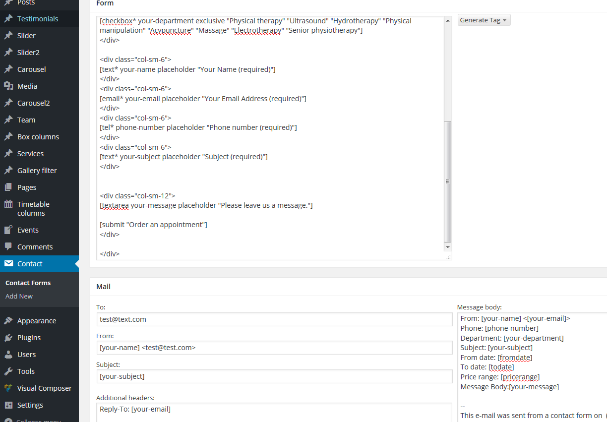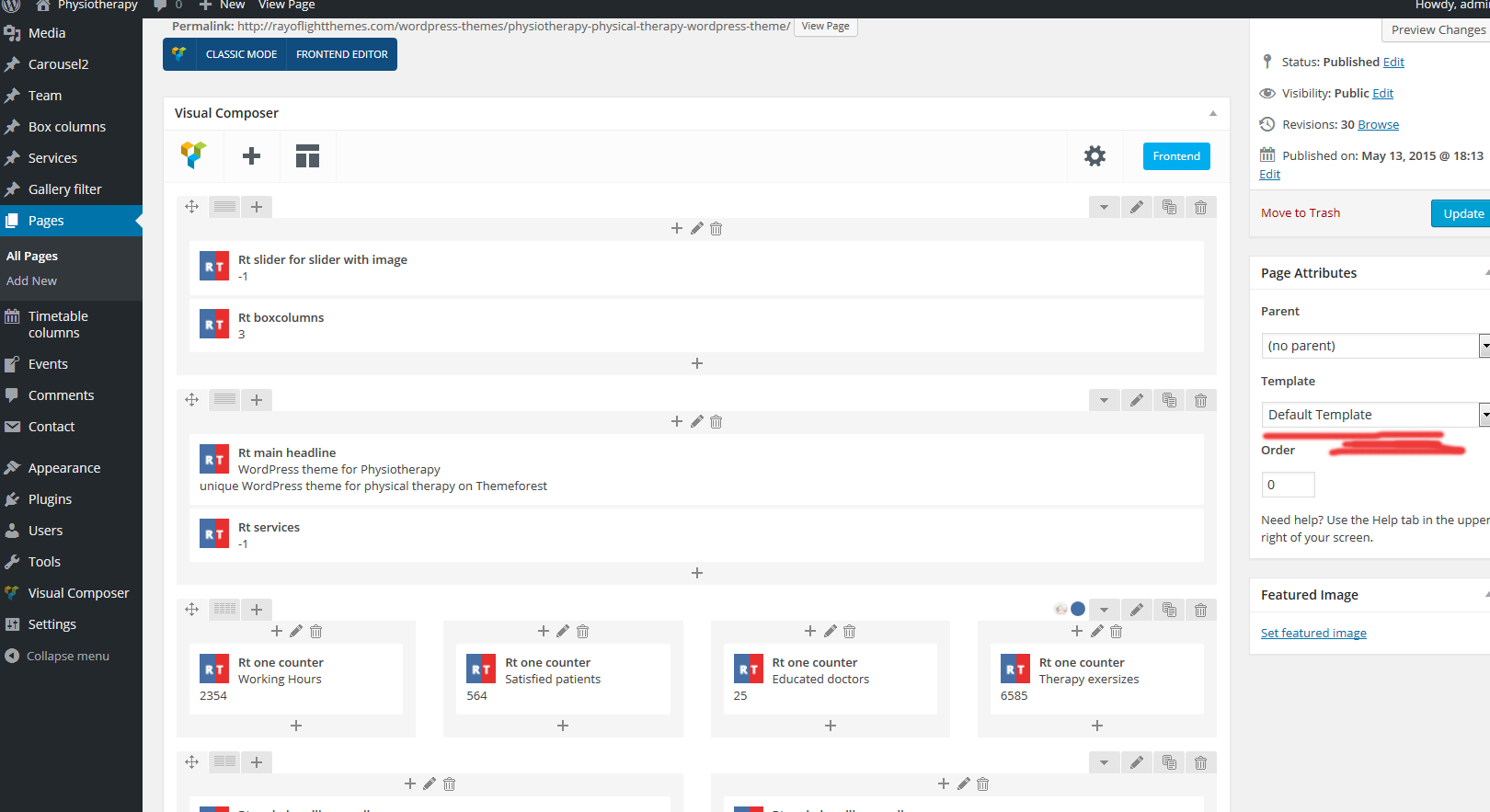 Custom post types and shortcodes are added via custom Theme's plugin rt-phyisotherapy-theme-functions. Custom post types are: slider, slider2, carousel, carousel2, team, box columns, services, gallery filter.