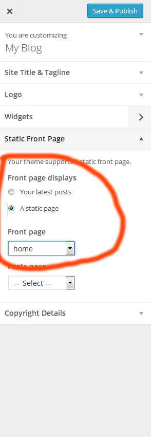 6. Go to appearance/customize and set static page (front page) for home page