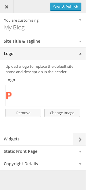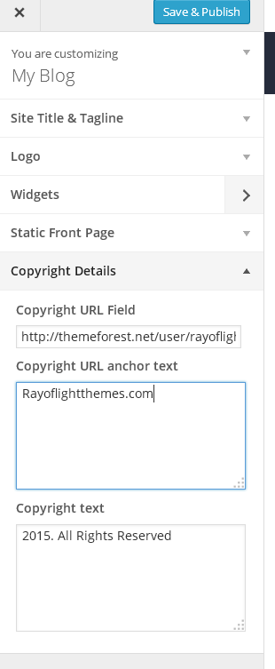9. Go to appearance/customize add your copyright details, upload logo and add site title and tagline.