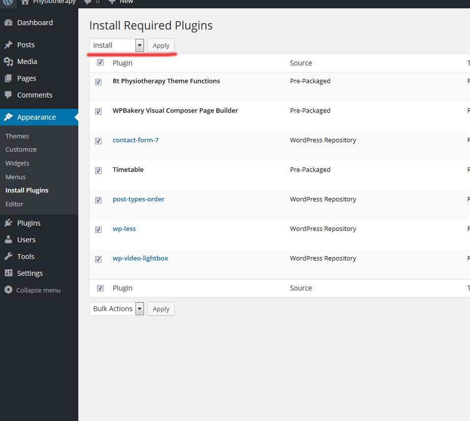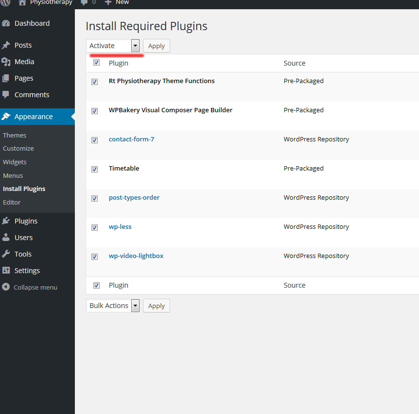 3 plugins are bundled with theme: 1. Rt physiotherapy-theme functions, 2. Visual Composer 3. Timetable Schedule