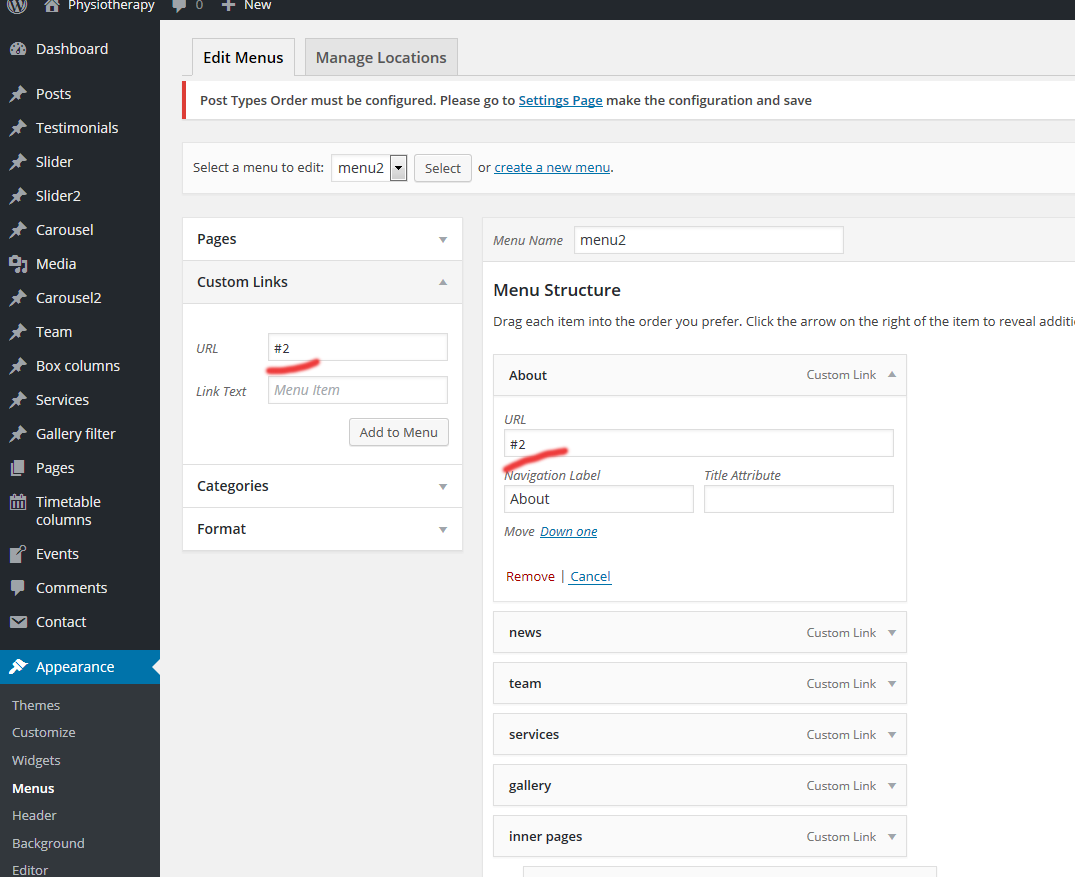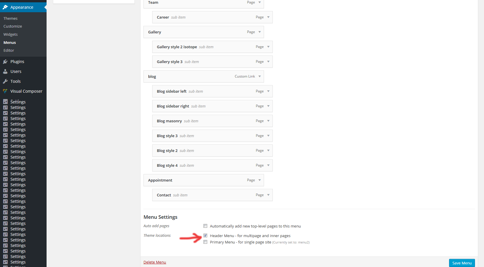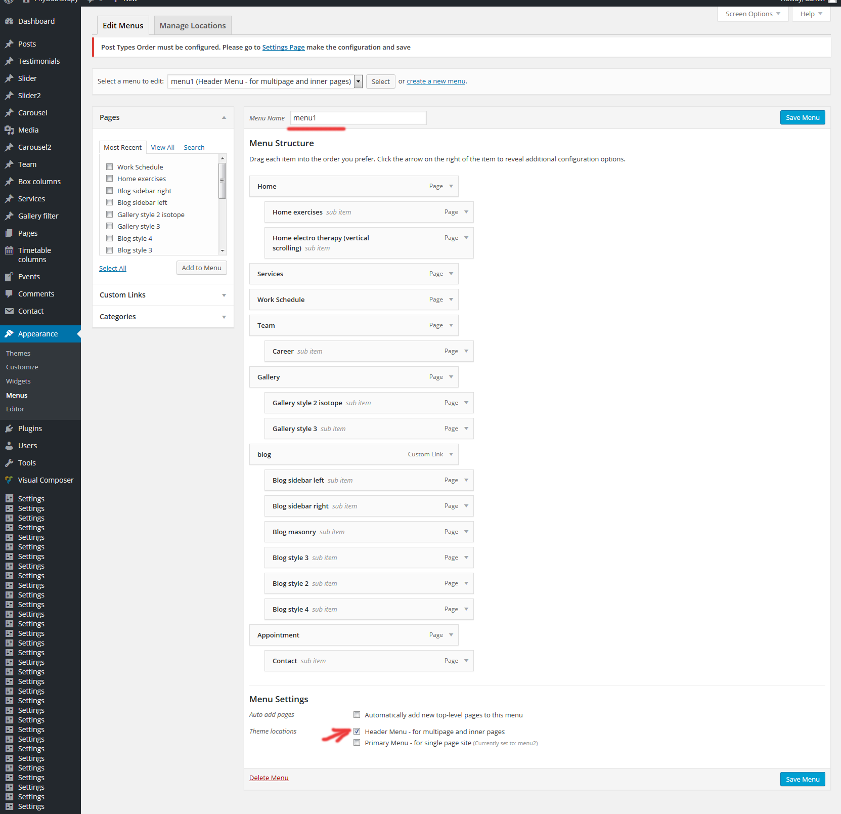 7. Go to appearance/menus and check if "menu1" and "menu2" appears. If you don't want to use one page homepage (vertical scroll) then you don't need menu2. In that case, you only need menu1 to be set for "Header menu". Menu2 is needed if you want to use vertical scroll and it needs to be set to "Primary menu"