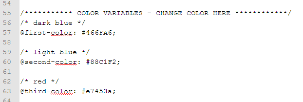 /*********** COLOR VARIABLES - CHANGE COLOR HERE ************/ /* dark blue */ @first-color: #466FA6; /* light blue */ @second-color: #88C1F2; /* red */ @third-color: #e7453a;