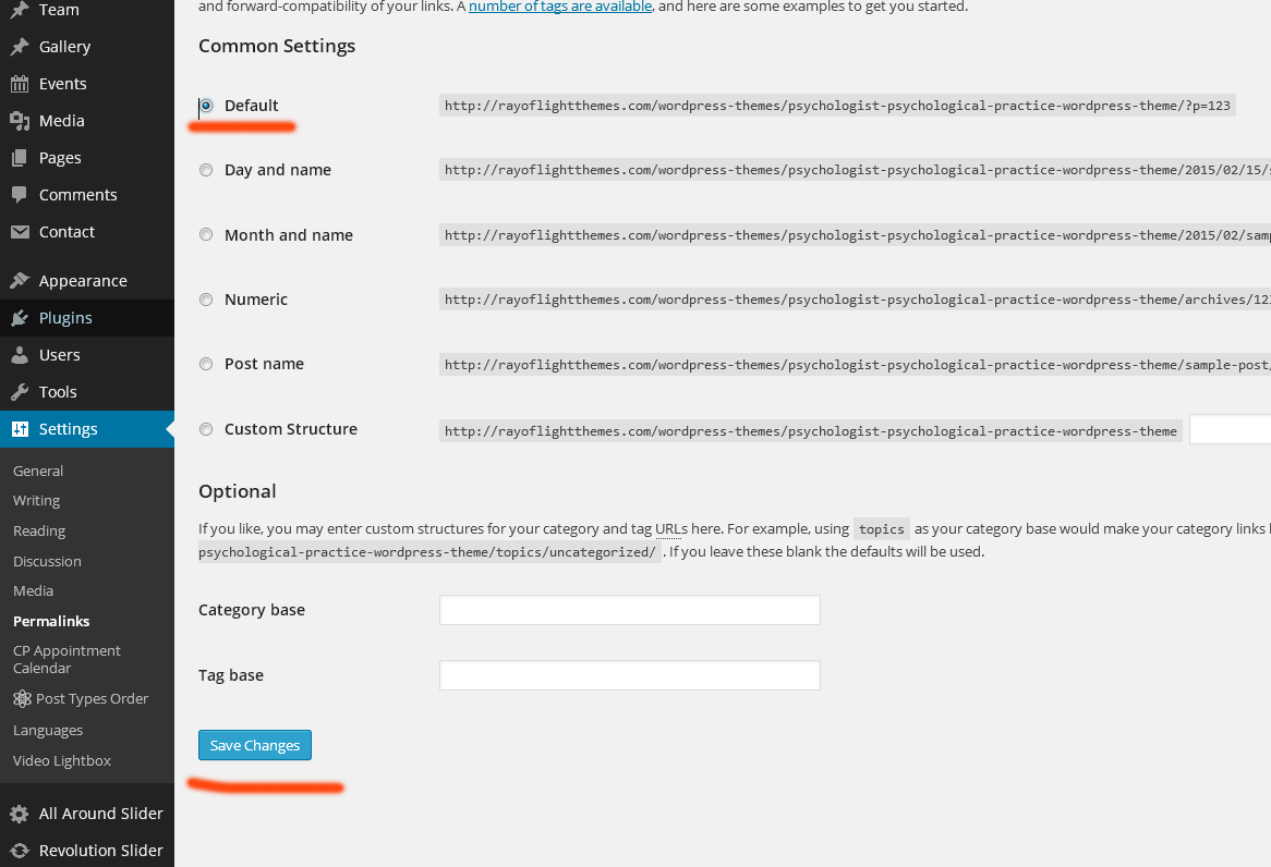 8. If you ever deactivate rt-physiotherapytheme-functions plugin or Theme it may be needed to repeat these steps again to make permalinks work again
